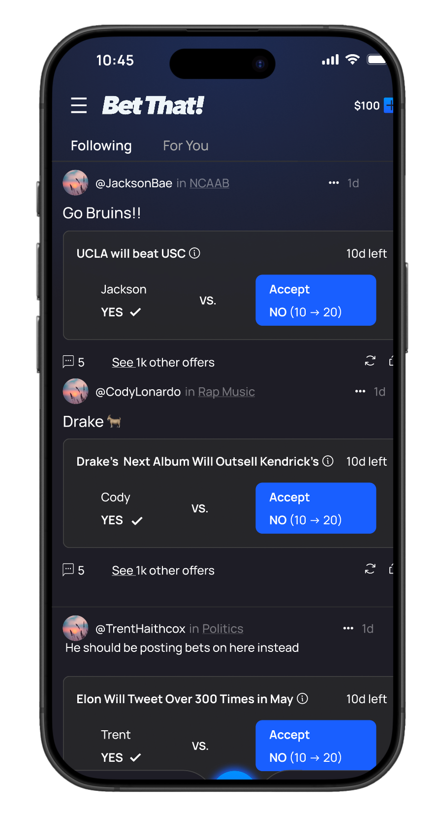 Accept or Counter: Scroll through your feed until you spot a take you disagree with. Tap to accept the other side, or send a counter with your own terms. Just like that, you’ve officially staked your opinion against another user. Good luck!