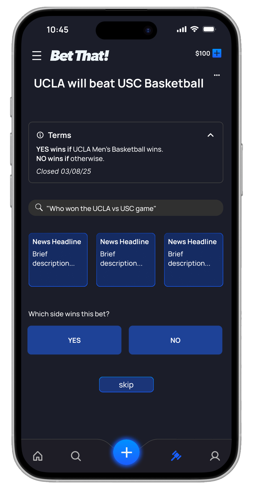 Post a Bet: Write your own terms on anything verifiable on the internet, set your odds, and share it to interest-based communities on Bet That, or send it in a link directly to a friend (or rival.)